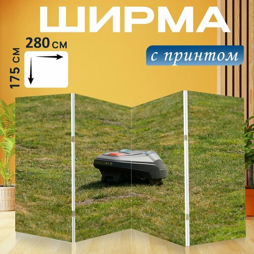 Ширма "Газонокосилка, аккумуляторная косилка, газонокосилка робот" раскладная перегородка для зонирования с принтом на холсте