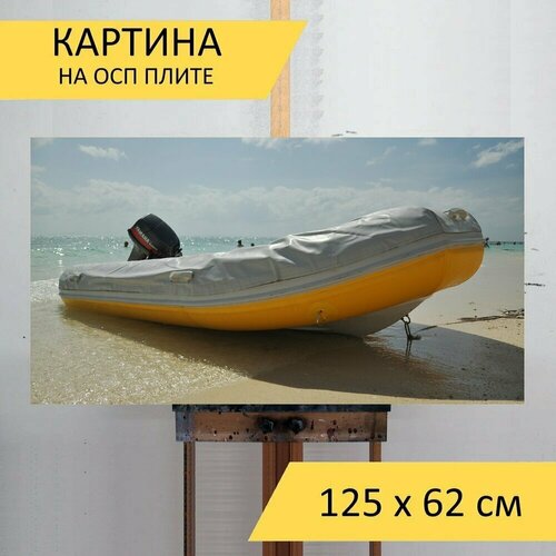 Картина на ОСП 125х62 см. "Моторная лодка, резиновая лодка, спасательный плот" горизонтальная, для интерьера, с креплениями