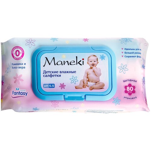 Maneki Салфетки влажные детские с экстрактом ромашки и алоэ вера, 80 шт. 600003369799