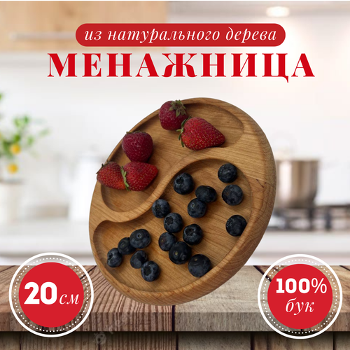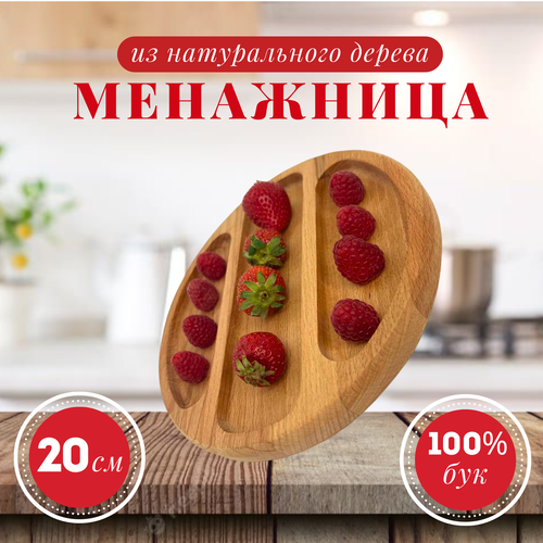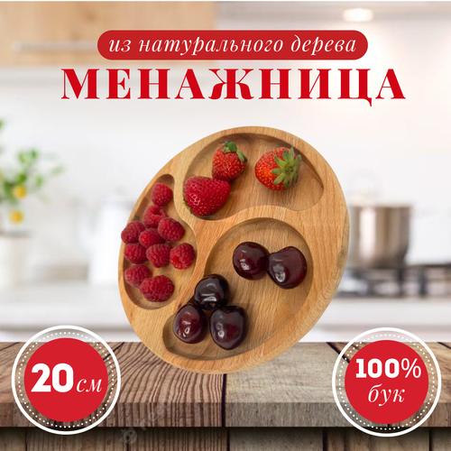 Менажница деревянная круглая 3 отд тарелка - форма для закусок, сыра, нарезки и десертов, 20 см, массив бука