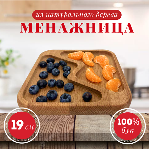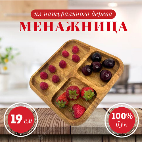 Менажница деревянная квадратная 3 отдела, тарелка - форма для закусок, сыра, нарезки и десертов, 19x19 см, массив бука