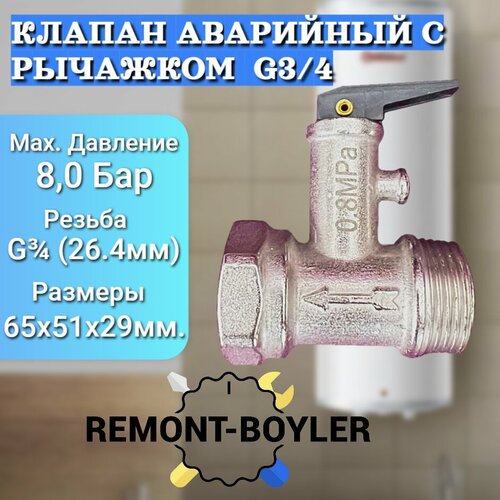 Клапан предохранительный с рычажком 3/4", 8,0 Бар для водонагревателей Thermex, Ariston, Electrolux и др.