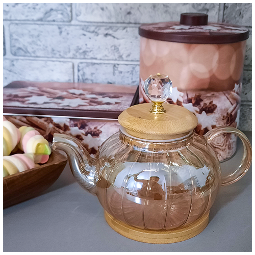 Заварочный чайник из жаропрочного стекла 400 мл, металлик, подставка и крышка из бамбука