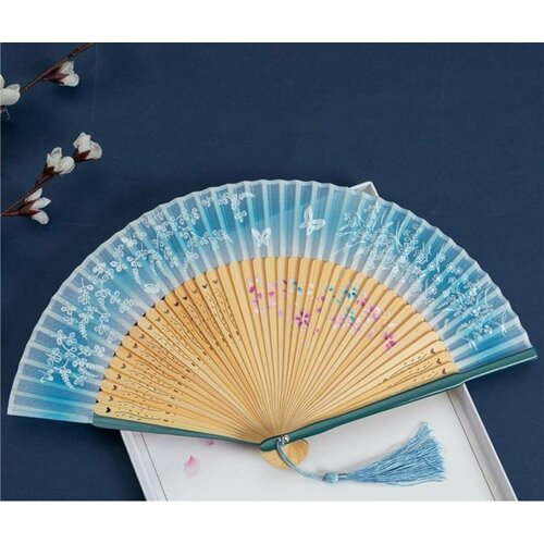 Веер складной, веер ручной работы, для танцев. Нежно-голубой с бабочками.