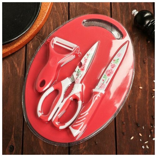 Набор кухонный, 3 предмета: нож, ножницы с антиналипающим покрытием, овощечистка, цвет красный