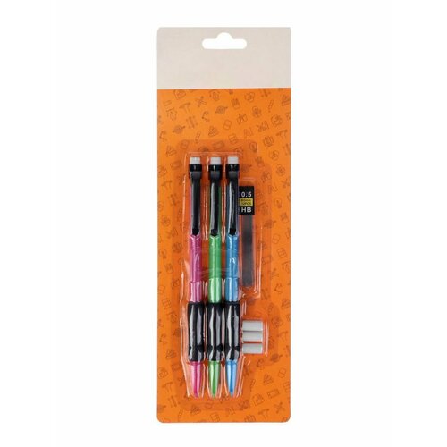 Набор карандашей автоматических 0,5 мм 3 штуки+грифели 0,5мм+3 шт, ластиков