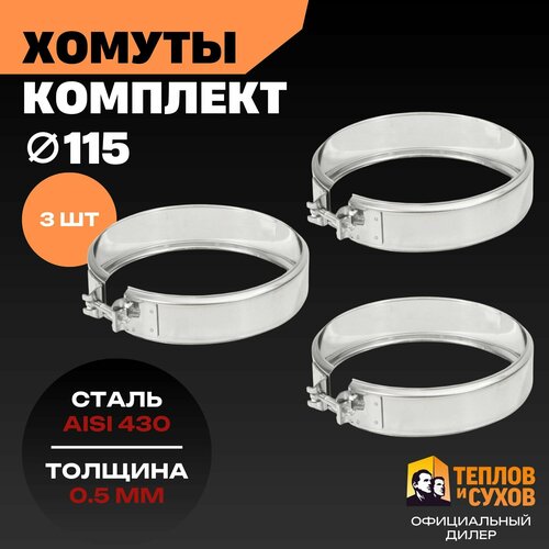 Комплект хомут трубный обжимной 115 для дымохода на болте 3 шт, нержавейка AISI 430, Теплов и Сухов