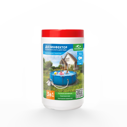 "АкваДача" Дезинфектор 3 в 1 МСХ КД (медленный стабилизированный хлор комплексного действия) табл. 20г, 1 кг (банка)