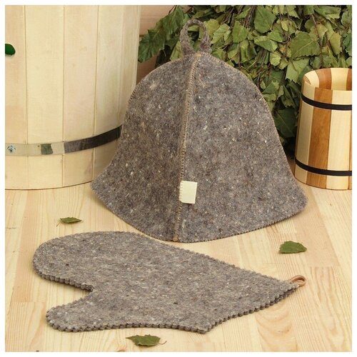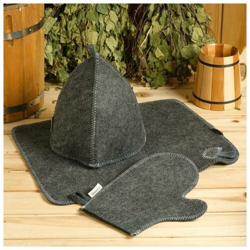 Добропаровъ Набор банный серый 3 предмета без вышивки (шапка, варежка, коврик) в плёнке