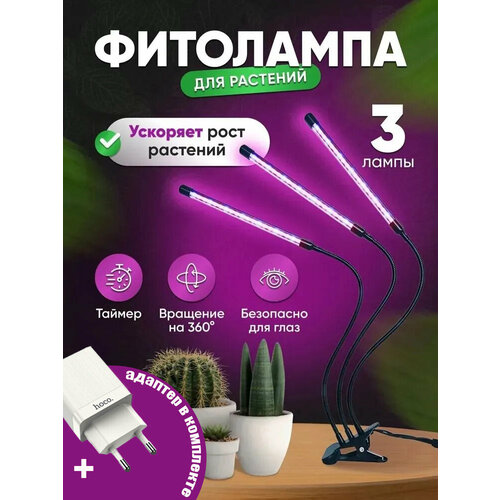 Светодиодная фитолампа - для растений, цветов и рассады с адаптером/Черная/3 светильника