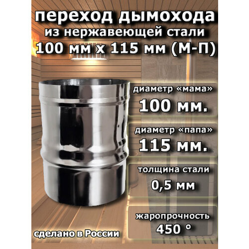 Переход дымохода из нерж. стали D 100-115 мм. (МП 430/0,5 мм. L 180 мм.)