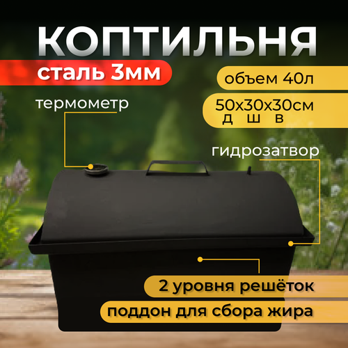 Коптильня горячего и холодного копчения - идеальное решение для ценителей наилучших копченых рыбных и мясных блюд. Изготовлена из толстого металла 3мм, что обеспечивает равномерное распределение тепла и даёт Вам наслаждение насыщенным вкусом копченостей, приготовленных на природе или в домашних условиях. Благодаря своим большим размерам 50х27х32см и трëм уровням решеток из нержавеющей стали вовнутрь легко поместиться много ваших любимых продуктов. Универсальность модели позволяет готовить как на улице так и дома благодаря наличию гидрозатвора. Полукруглая крышка в форме сферы увеличивает объем и исключает капание конденсата и дегтя на продукты, направляя его по своду в гидрозатвор. Поддон для сбора жира на ножах снижает возможность возгорания щепы. Термометр на крышке коптильни помогает поддерживать температуру 130-140 градусов Цельсия, что оптимальное для горячего копчения.