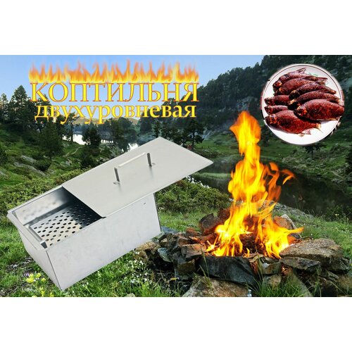 Мясо или рыба домашнего копчения - деликатес, который не оставит равнодушным даже искушенного гурмана. Коптильня двухъярусная, изготовленная из нержавеющей стали толщиной 1мм, представляет собой металлический ящик с крышкой, внутри которого имеется накопительный поддон для жира, а также два уровня решеток. Приготовление продуктов производится на открытом воздухе путем установки коптильни на костёр. При использовании коптильни достаточно одной горсти опилок лиственных деревьев. Данная коптильня предназначена только для копчения на открытом огне.