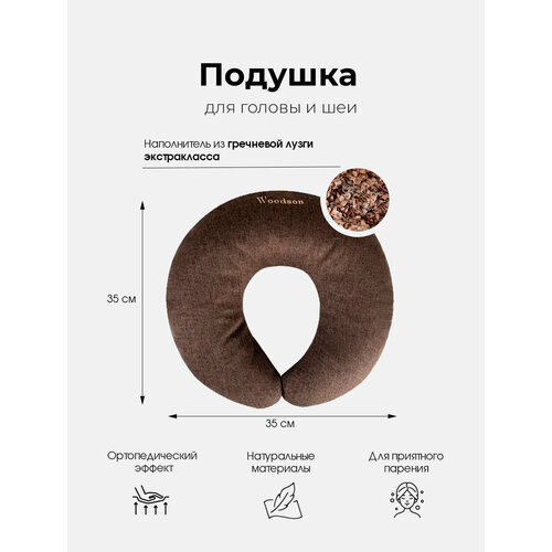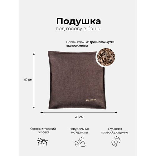 Ортопедическая подушка для головы в баню и сауну массажная Woodson, коричневого цвета, с наполнителем из гречичной лузги и двумя чехлами - защитным и водонепроницаемым, размеры подушки 40х40 см