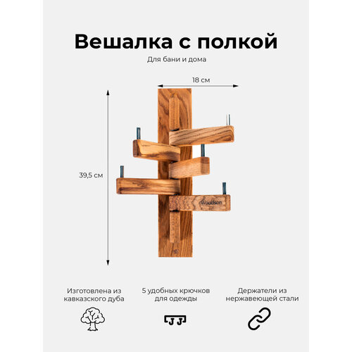 Деревянная вешалка из дуба Woodson Эдельвейс с 5 держателями из нержавеющей стали / вешалка для бани, для сауны, для дома, для дачи
