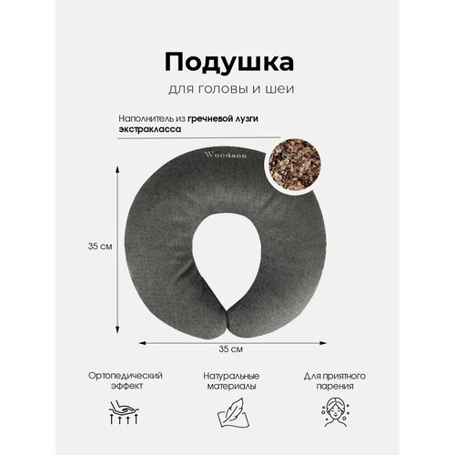 Анатомическая подушка для головы в баню и сауну массажная Woodson Второе дыхание, серого цвета, с наполнителем из гречичной лузги и двумя чехлами - защитным и водонепроницаемым