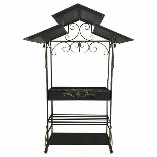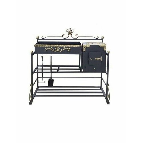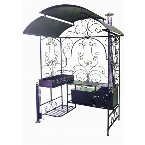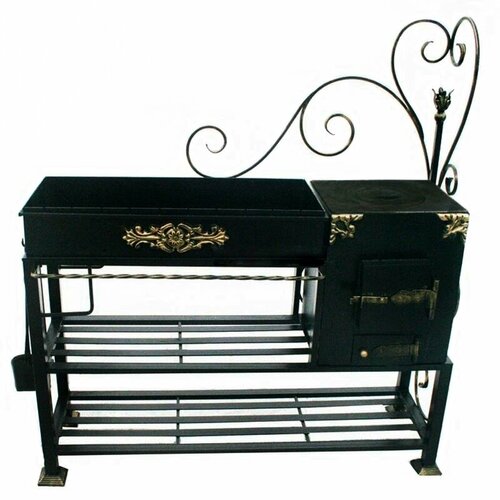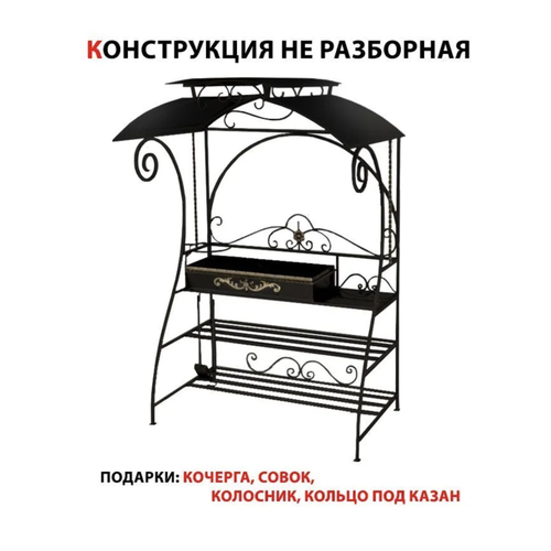 Садовод» – это стационарная конструкция, которая предназначена для круглогодичного использования. Конструкция украшена декоративными элементами. Модель оборудована дровницей для хранения дров и углей и небольшая полка для кухонной утвари. В комплекте к мангалу идут совок, кочерга, колосник, кольцо для казана.