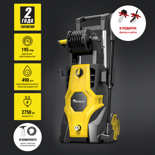 Мойка высокого давления KOLNER K195 LUX, 2700Вт, 195бар, 500л/ч, катушка, черная, желтая