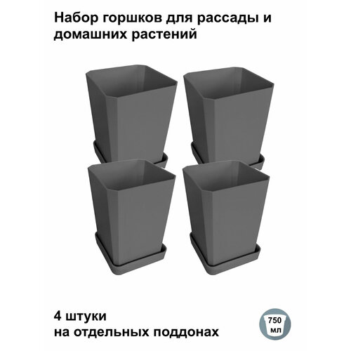 Горшки для рассады и цветов, 4 штуки на отдельных поддонах, антрацит