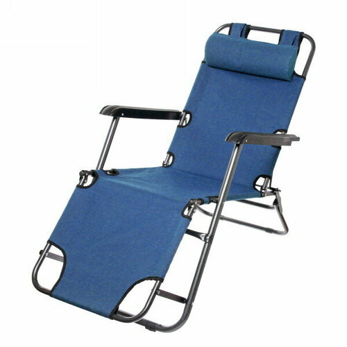 Кресло-шезлонг с подлокотниками для дома, для дачи, на пляж и пикник складной с синей тканью без шлифовки