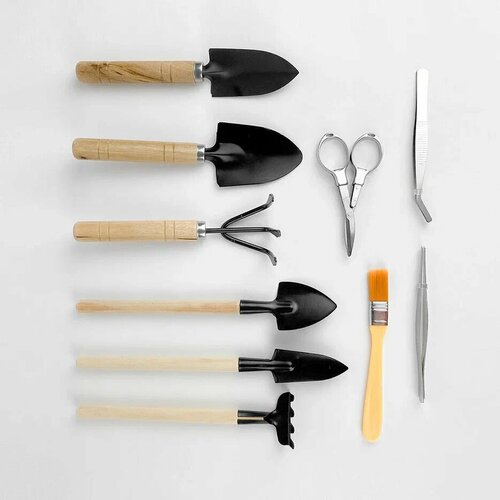 Набор инструментов для растений 10 предметов: пинцет 2 шт, ножницы, кисточка, инструменты с деревянными ручками - лопатка 2 шт, совок 2 шт, грабли, рыхлитель