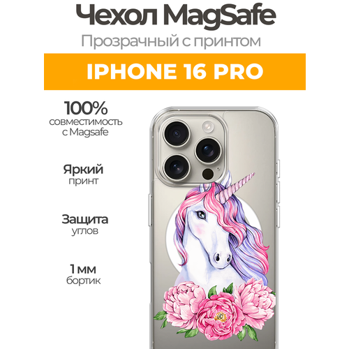Чехол на Айфон 16 Про MagSafe с магнитом с принтом "Единорог с пионами"