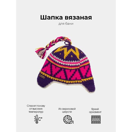 Вязаная шапка унисекс для бани и сауны Woodson Viking Pinky с одной косичкой и ушками, изготовленная из акриловой шерсти, с оригинальным рисунком-орнаментом, фиолетовая / Подарок для мужчин и женщин