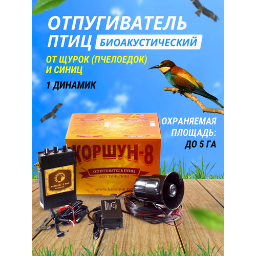 Отпугиватель птиц биоакустический Коршун-8 от щурок и синиц с 1 дин звуковой для сада дачного участка огорода защита клубники черешни ягод урожая