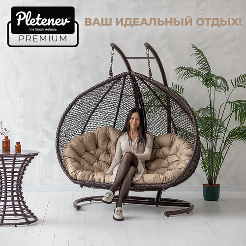 Подвесное кресло Queen трехместное коричневое с бежевой водоотталкивающей подушкой