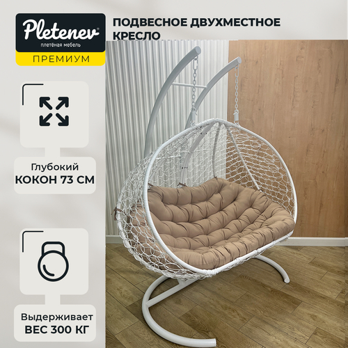 Подвесное кресло Pletenev Двухместное белое кресло с Темно-бежевой подушкой