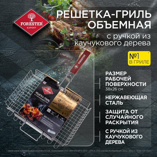 Решетка - гриль, для мангала, FORESTER 26*38 см объемная большая, нержавеющая сталь с ручками из каучукового дерева