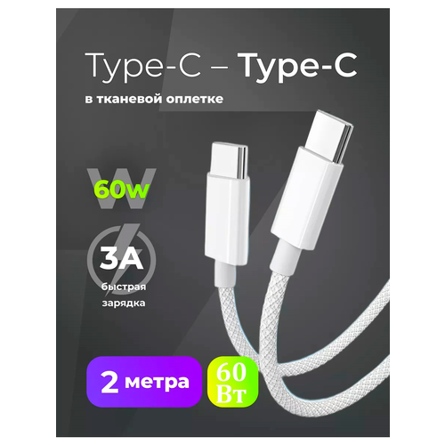 Кабель type-c to type-c 2 метра 60 Вт нейлон /Кабель для быстрой зарядки 2м