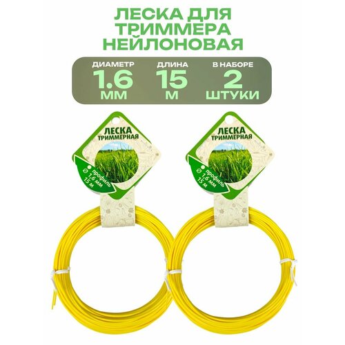 Леска для триммера d1.6 мм, 2 шт по 15 м, форма круг, цвет желтый, из прочного нейлона, поможет скосить сорняки и траву, подровнять кустарники на даче или приусадебном участке