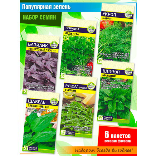 Набор семян зелени: базилик, укроп, петрушка, щавель, рукола, шпинат от Семена Алтая (6 пачек)