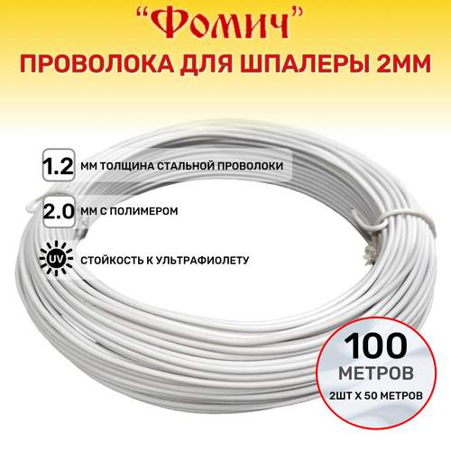 Проволока для шпалеры 2 мм 100 метров (толщина стальной проволоки 1.2 мм с полимером 2 мм ) Белая 2шт х 50 метров.