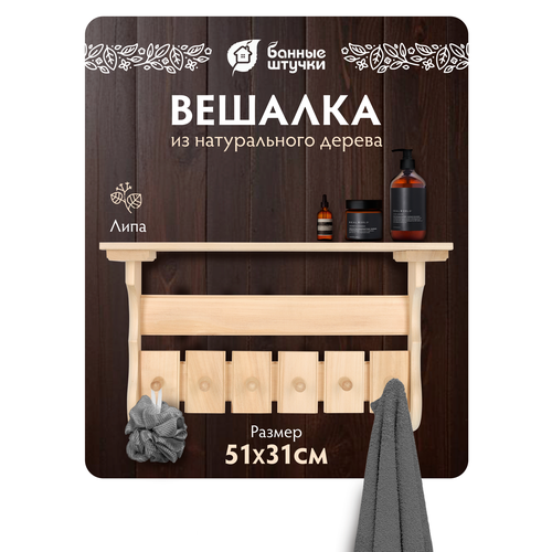Полка с вешалкой, 6 рожков, 54х31х14 см, липа Класс Б "Банные штучки"