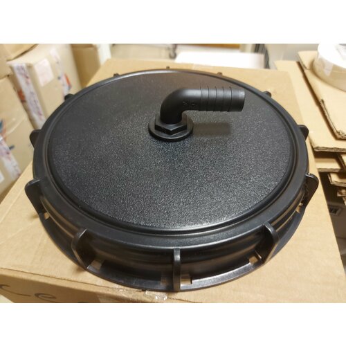 Крышка с крупной резьбой 225мм сверху еврокуба с угловым отводом 51мм для шланга (для удобного наполнения).