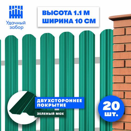 Штакетник металлический Классик (двусторонний окрас, цвет зеленый мох, высота 1.1 м, ширина планки 10 см, 20 шт, саморезы в комплекте)