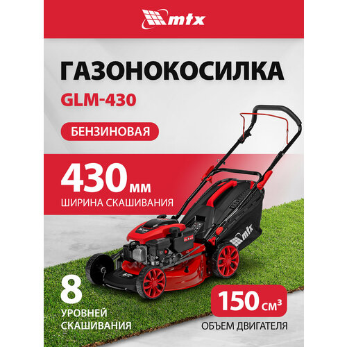 Газонокосилка бензиновая MTX GLM-430, 43 см, 3.5 л. с, 150 см3, 8 уровней скашивания от 25 до 75 мм и 4 режима: сбор в травосборник 45 л, боковой и задний выброс и мульчирование, 58830