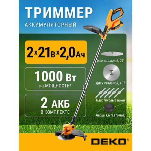 Триммер аккумуляторный DEKO DKTR21 2 аккумулятора, 350 Вт, 2А·ч, 21 В, с АКБ, 14.5 см