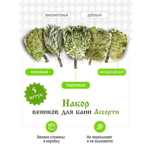 Набор веников для бани Дубовый, Березовый, Кленовый, Эвкалиптовый, Канадский дуб