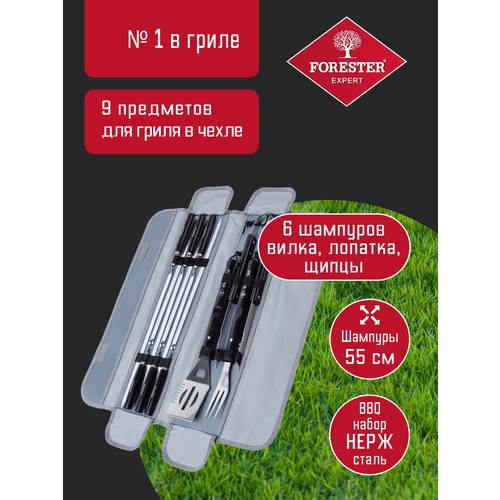 Набор аксессуаров для гриля в кофре Forester : вилка, лопатка, щипцы, 6 шампуров