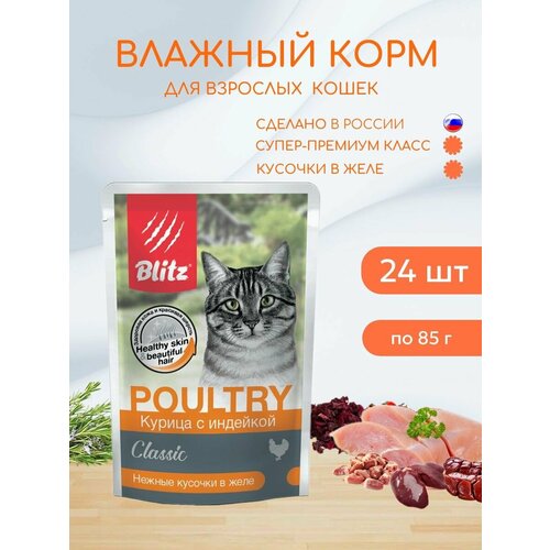 Влажный корм для кошек Blitz 85г*24шт Classic Poultry Курица с индейкой в желе/Блиц Влажный корм для кошек