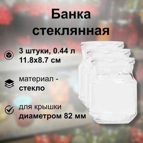 Банка "Горшочек" 0.44 л (3 шт), твист-офф 82 мм. Многоразовая емкость для консервации фруктов, ягод и овощей, подходит для длительного хранения меда, сухофруктов, варенья и других продуктов