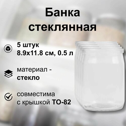 Банка стеклянная 0.5 л, СКО 82 мм, 8.9x11.8 см, 5 шт. Многоразовая емкость для консервации фруктов, ягод и овощей, подходит для длительного хранения меда, сухофруктов, варенья и других продуктов
