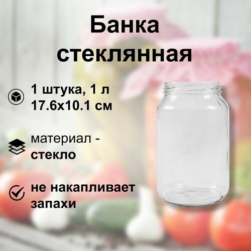Банка стеклянная, диаметр 82 мм, объем 1 л, 17.6x10.1 см, без крышки: для закручивания компотов, соусов и соков
