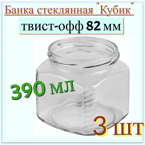 Банка стеклянная "Кубик" 0.39 л набор 3 шт, тип крышки твист-офф 82 мм. Многоразовая емкость для консервации фруктов, ягод и овощей, подходит для длительного хранения меда, сухофруктов, варенья