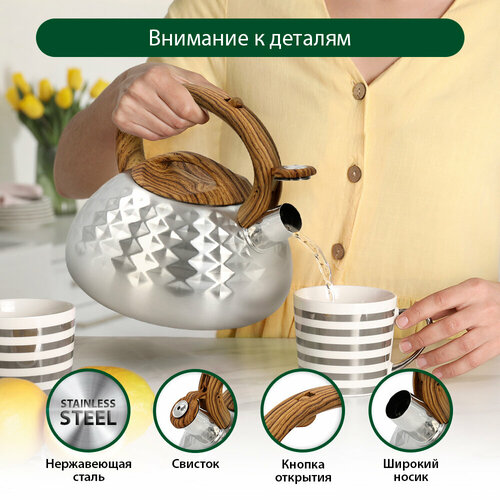 Чайник HOME ELEMENT, нержавеющая сталь, 2 литра, со свистком