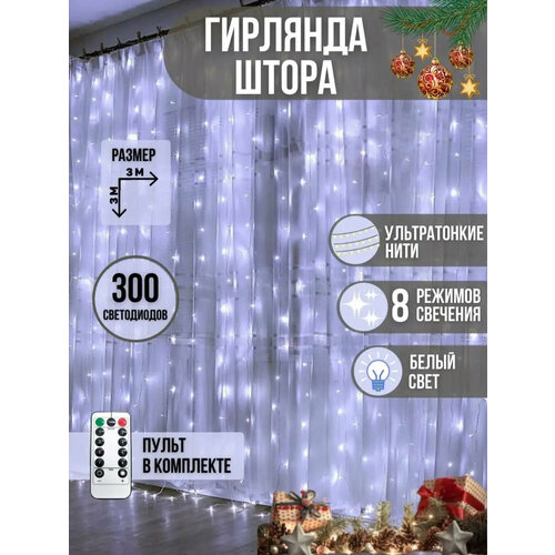 Гирлянда MILAND проволока светодиодная Штора Занавес Роса, 3x3 м, 10 нитей, 300 LED-ламп , USB, пульт ДУ, холодный свет