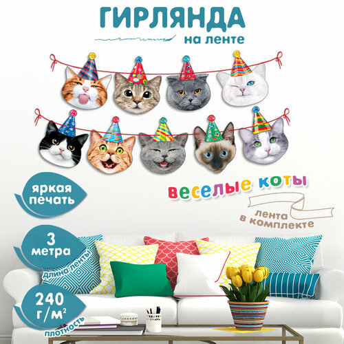 Гирлянда-растяжка бумажная на стену для украшения интерьера и фотозоны "Веселые коты", Happy Birthday